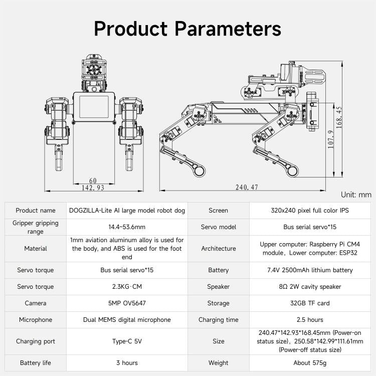 1. DOGZILLA-Lite is a 15-DOF desktop AI bionic robot dog. It is made of aluminum alloy and comes with a robotic arm and gripper, which can flexibly perform grasping tasks. Built-in Raspberry Pi CM4 module, supports face detection, object recognition, and AI visual interaction. Combined with a large model, it can not only understand instructions, but also realize free dialogue, realizing true multimodal intelligent interaction. It has advanced sports capabilities such as omnidirectional movement, six-dimensional posture control, and dynamic balance. With more than 40+ functions, from basic remote control to embodied intelligent applications, it allows learning, entertainment, and technology research to be fully upgraded. In front of the robot dog, a 2.0-inch IPS display is integrated to display 35 different expressions.Support two control methods: BT APP and WiFi APP. Whether it is programming learning, AI experiments, or creative interaction, DOGZILLA-Lite is your best partner.