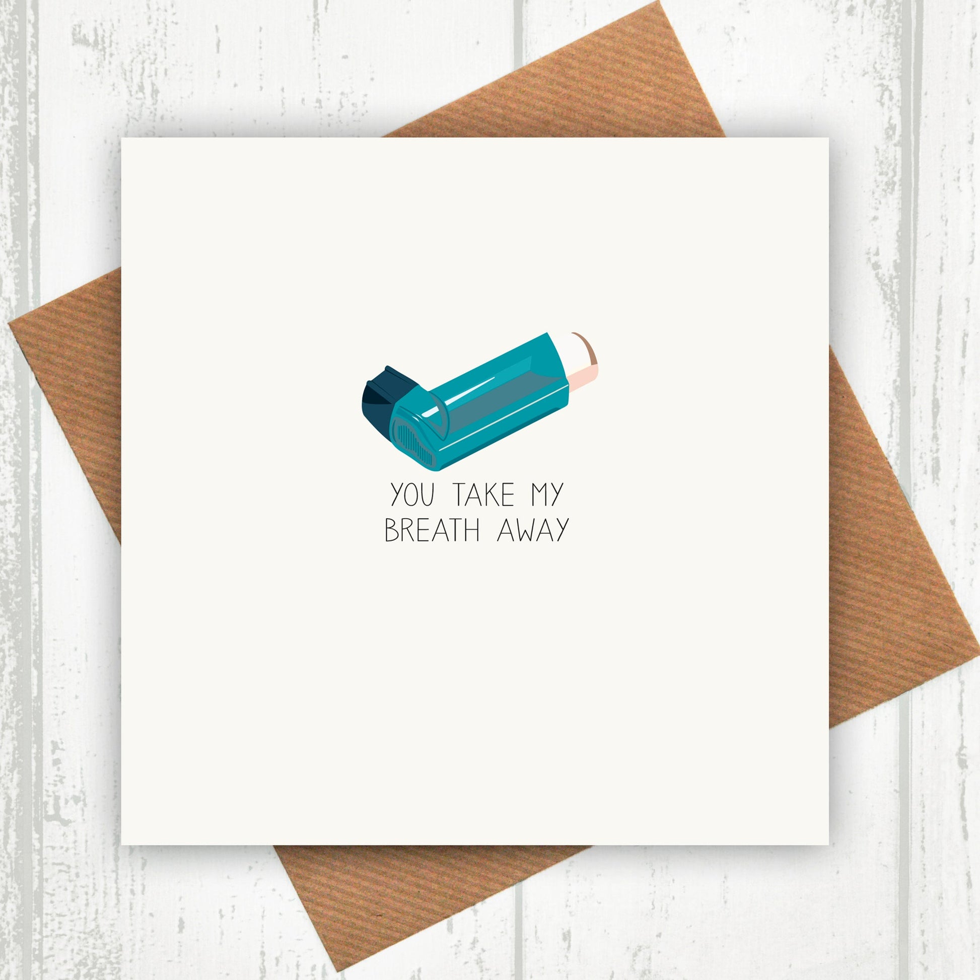 Printed on premium quality, FSC-certified 350gsm thick card, the design features a graphic of an asthma inhaler, with the caption 'You Take My Breath Away'.